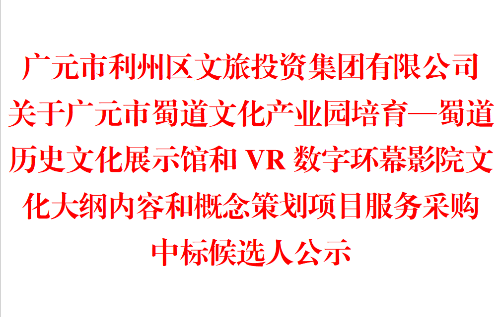 广元市利州区文旅投资集团有限公司 关于广元市蜀道文化产业园培育—蜀道历史文化展示馆和VR数字环幕影院文化大纲内容和概念策划项目服务采购中标候选人公示