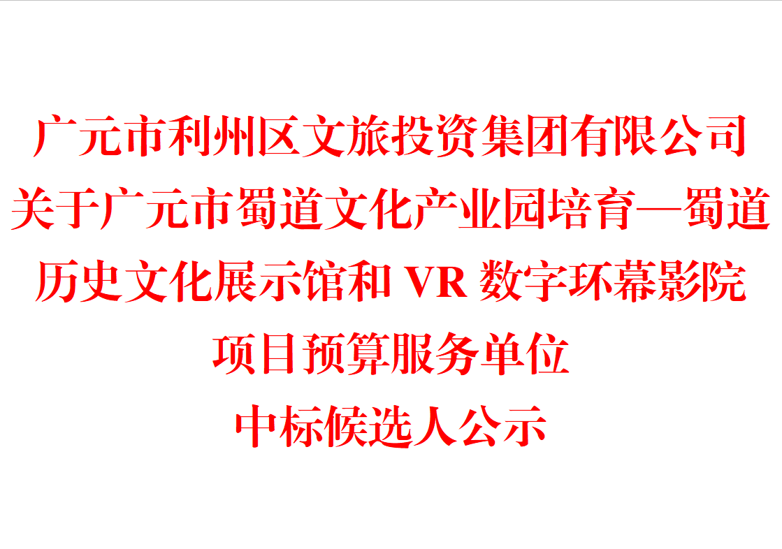 广元市利州区文旅投资集团有限公司 关于广元市蜀道文化产业园培育—蜀道历史文化展示馆和VR数字环幕影院项目预算服务单位 中标候选人公示