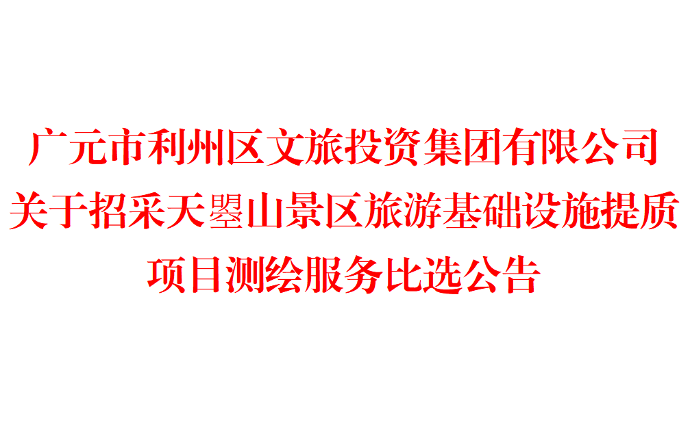 广元市利州区文旅投资集团有限公司天曌山景区旅游基础设施提质项目测绘服务比选公告根据业务需求,现组织对天曌山景区旅游基础设施提质项目测绘服务单位采购进行公开比选,并以最低价中标的形式确定服务商,...