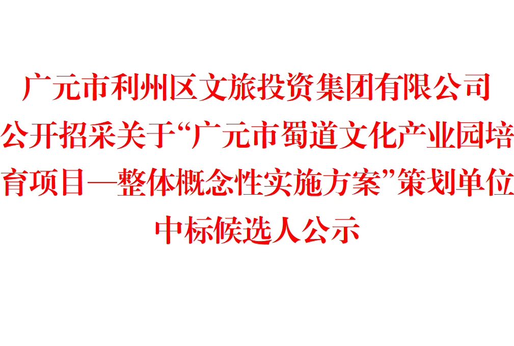 广元市利州区文旅投资集团有限公司 公开招采关于“广元市蜀道文化产业园培育项目—整体概念性实施方案” 策划单位中标候选人公示