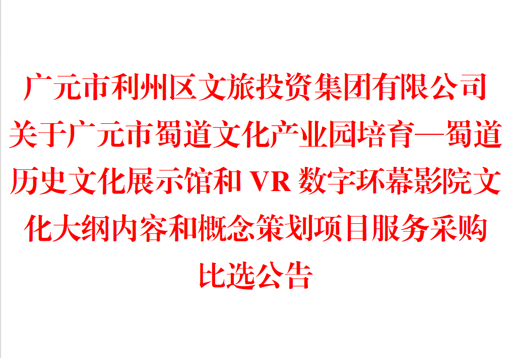 广元市利州区文旅投资集团有限公司 关于广元市蜀道文化产业园培育—蜀道历史文化展示馆和VR数字环幕影院文化大纲内容和概念策划 项目服务采购比选公告