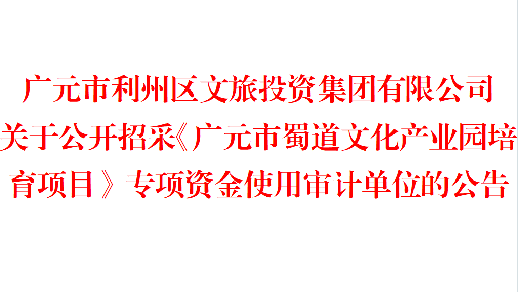 广元市利州区文旅投资集团有限公司关于公开招采《广元市蜀道文化产业园培育项目》专项资金使用审计单位的公告 为规范项目专项资金使用,明晰《广元市蜀道文化产业园培育项目》前期推进情况,现拟通过公开招...