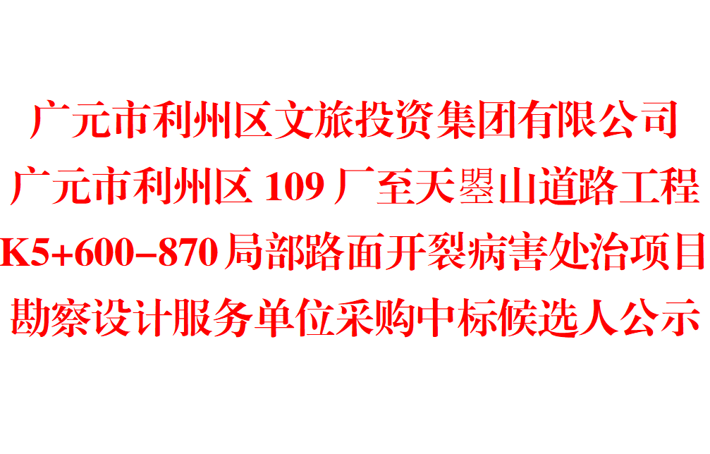 中标候选人公示 项目及标段名称广元市利州区109厂至天曌山道路工程 K5+600-870 局部路面开裂病害处治项目勘察设计服务单位采购业主单位广元市利州区文旅投资集团有限公司联系电话0839-...
