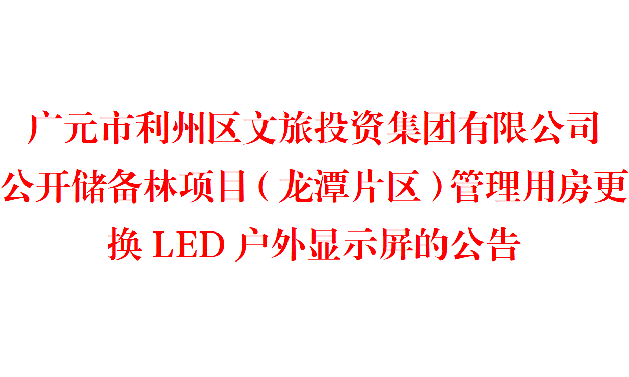 广元市利州区文旅投资集团有限公司公开储备林项目(龙潭片区)管理用房更换LED户外显示屏的公告 为更好推进储备林项目实施(龙潭片区),加强宣传和提升广元市重点项目影响力,助推下一步招商引资工作,...