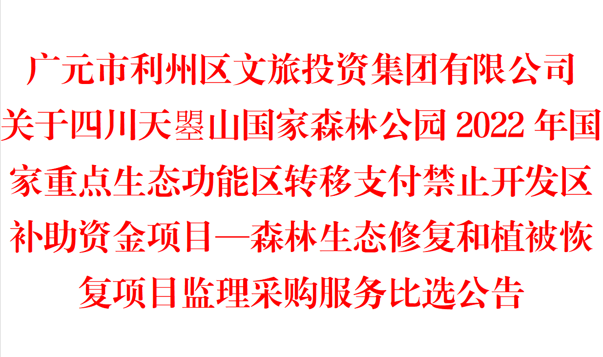 广元市利州区文旅投资集团有限公司关于四川天曌山国家森林公园2022年国家重点生态功能区转移支付禁止开发区补助资金项目—森林生态修复和植被恢复项目监理采购服务比选公告根据业务需求,现组织对四川天...