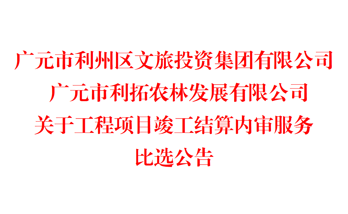 广元市利州区文旅投资集团有限公司广元市利拓农林发展有限公司关于工程项目竣工结算内审服务比选公告 根据业务需求,现组织工程项目竣工结算内审服务单位进行公开比选,并以最低价中标的形式确定服务商,具...