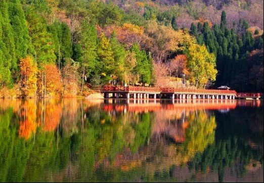 日月湖一年四季分明,景色各异。春夏时节,湖面涟漪不绝,湛蓝碧透,蓝天白云,青山绿树倒映其间,熠熠生辉,如嵌在群山之中的一颗璀璨明珠。